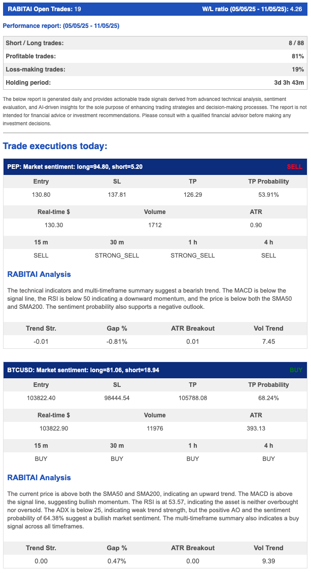 After each daily scan, RABITAI generates a detailed HTML report that includes all actionable signals, performance metrics, and news sentiment. This report is emailed to users and includes trade charts, multi-timeframe votes, and AI-generated rationales for each trade. The same signals are also posted to Discord and Twitter for real-time alerts.